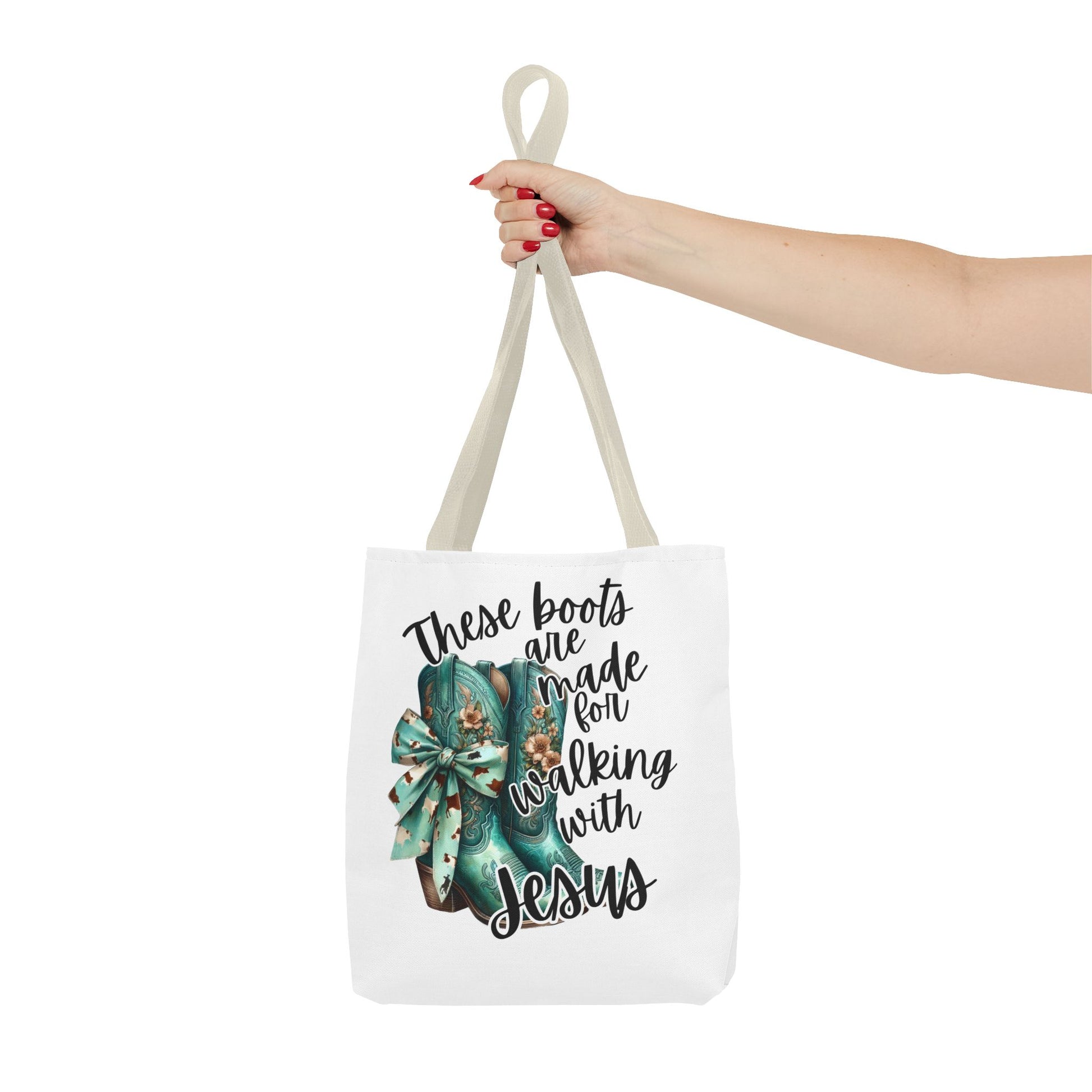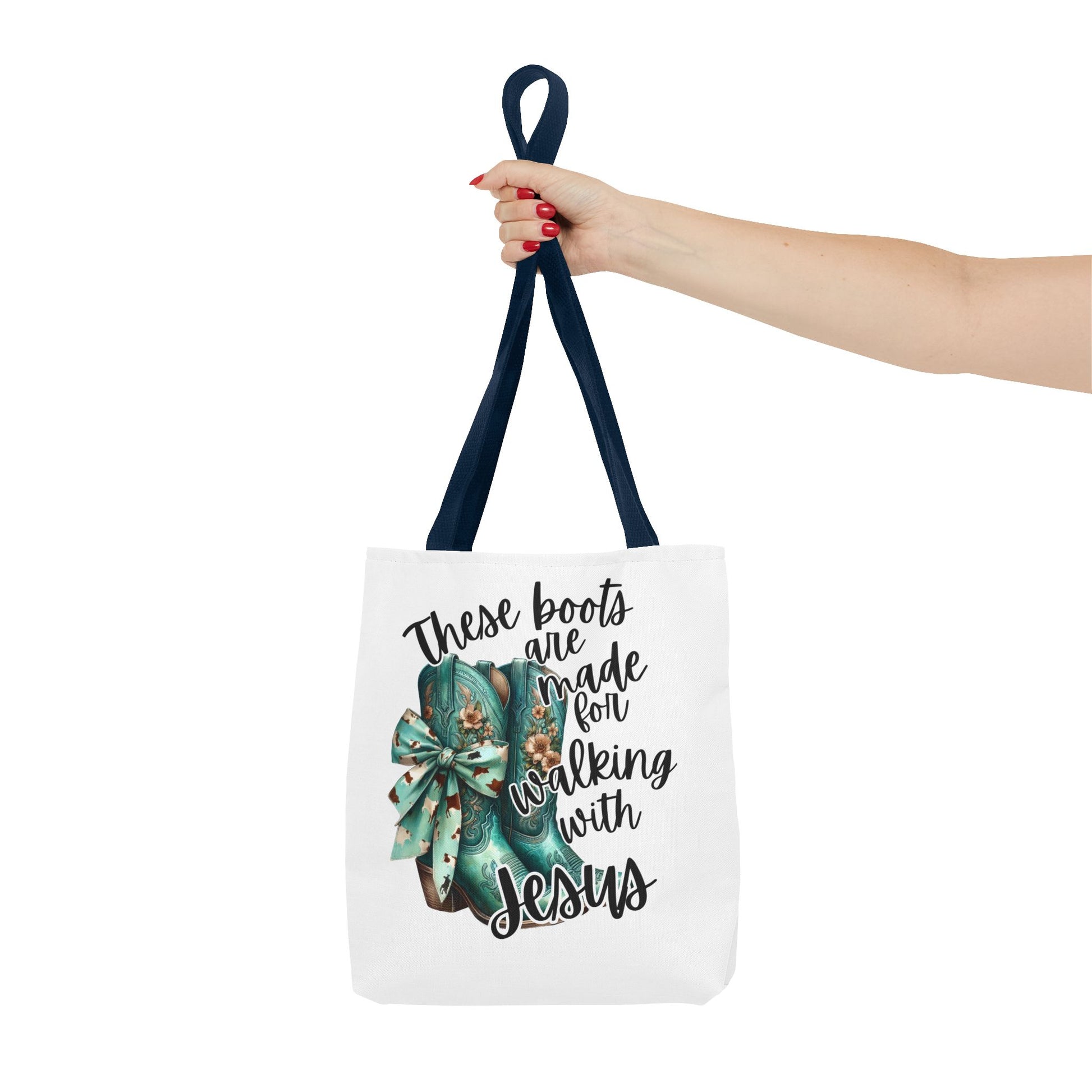Inspirational Christian Tote Bag - "These Boots Are Made for Walking with Jesus"